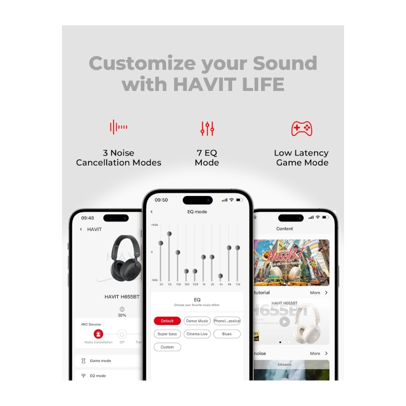 صوت عالي الدقة (Hi-Res Audio): مزودة بمحركات صوت بقطر ملم مع دعم معيار Hi-Res Audio، مما يوفر تفاصيل صوتية غنية، بيس قوي (Super Bass)، ووضوح استثنائي عبر تطبيق HAVIT LIFE الذي يتيح تخصيص معادل الصوت (EQ).