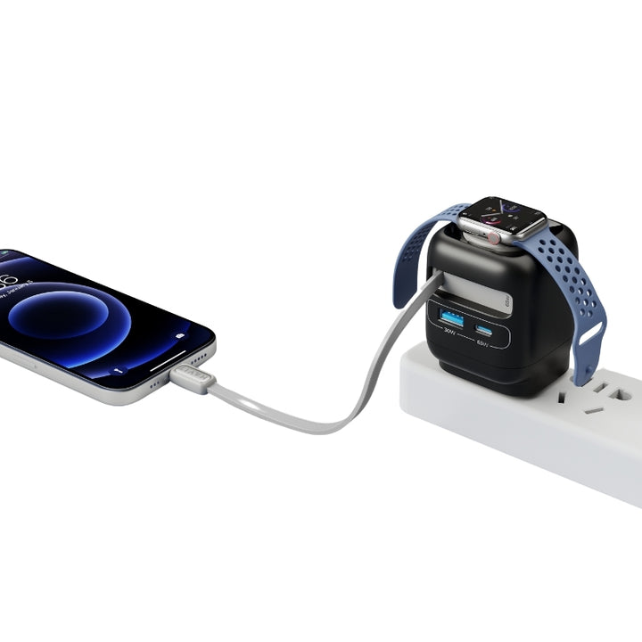 شاحن سفر نهائي: يوفر حل شحن شامل لجميع أجهزتك (اللابتوب، الهاتف، الساعة) في حجم مناسب للجيب.