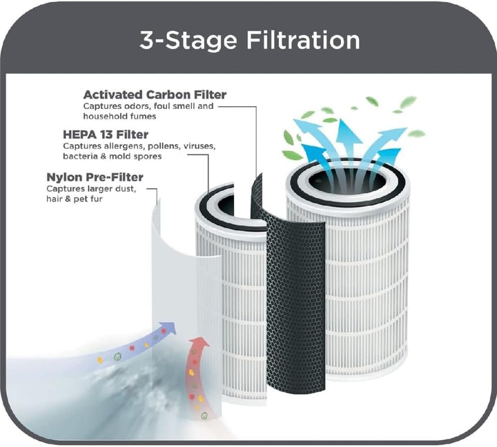 فلتر HEPA حقيقي: يزيل 99.97% من الجسيمات الدقيقة التي يصل حجمها إلى 0.3 ميكرون، مثل حبوب اللقاح، الغبار، ووبر الحيوانات الأليفة.