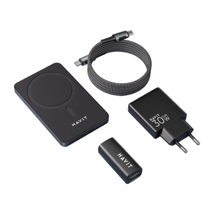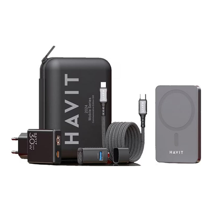 Havit 2024 EU (Power Bank Kit) حزمة 4 -في- 1 : شاحن لاسلكي 20W ، شاحن جداري 30W ، Hub، وكابل 60W