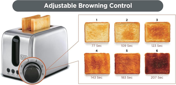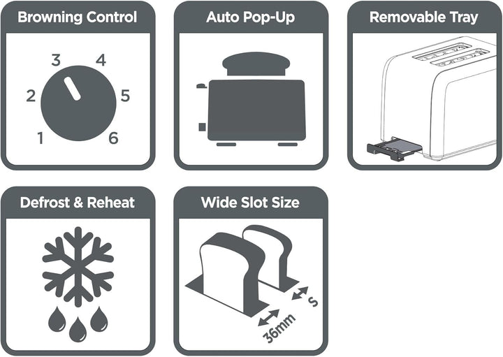 • وظائف إضافية: خاصية التذويب (Defrost) للخبز المجمد، وخاصية إعادة التسخين (Reheat) للخبز البارد، بالإضافة إلى زر إلغاء التحميص (Cancel).