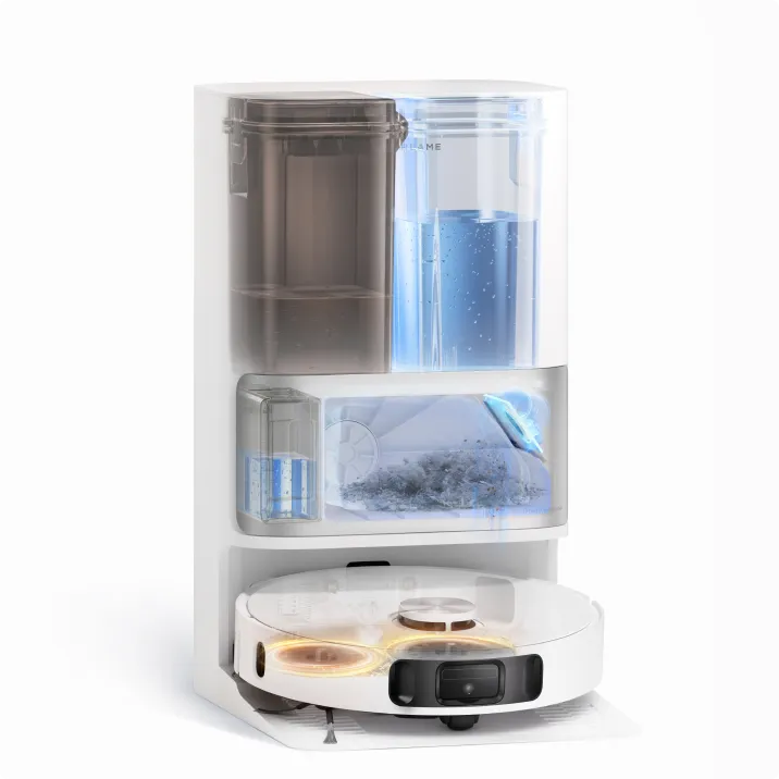 • الجهاز يحتوي محطة قاعدة أوتوماتيكية تسوي عدة شغلات: تفرغ الغبار، تغسل الممسحة، تنشفها، وتعيد تعبئة المياه تلقائياً.